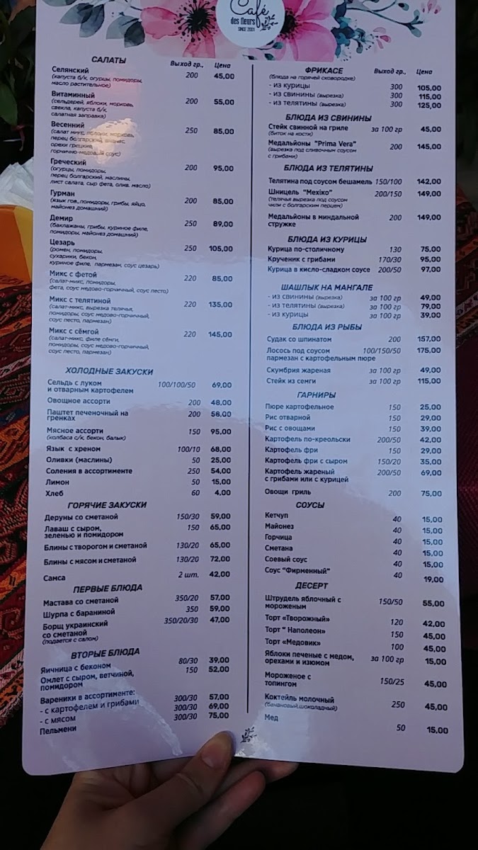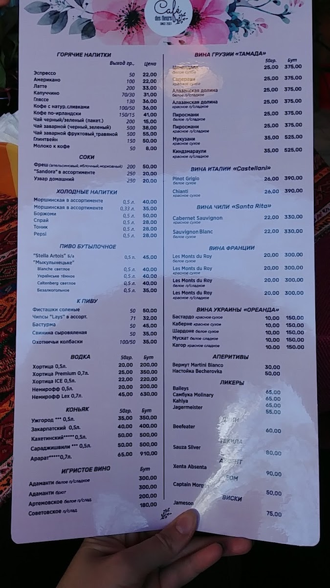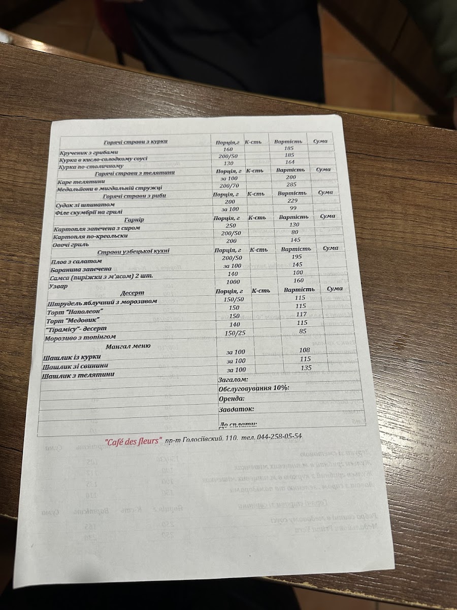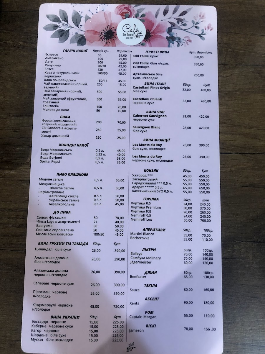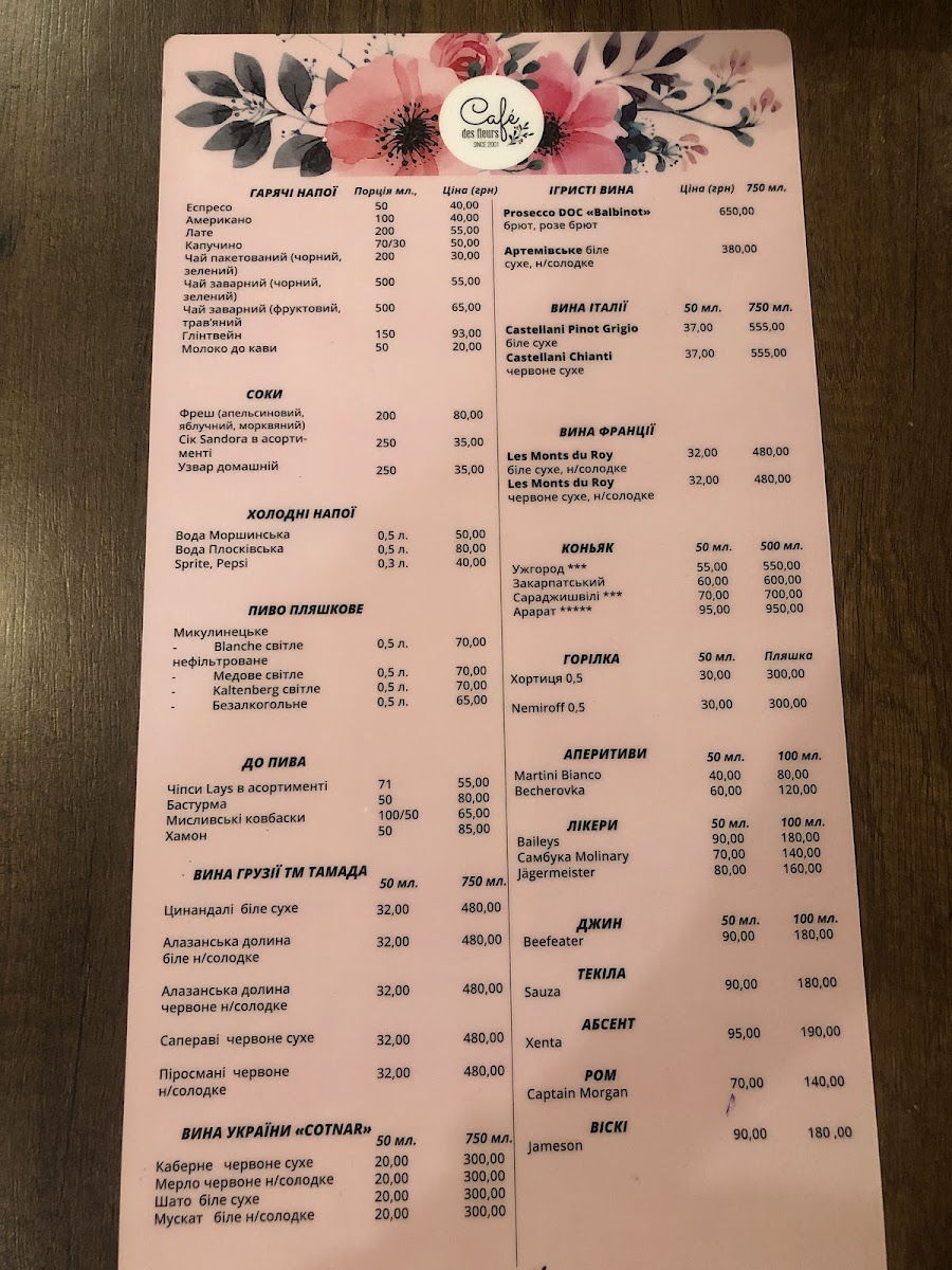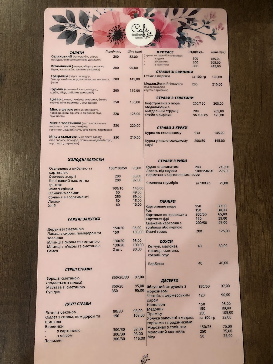 Nestled on Holosiivskyi prospekt in Kyiv, Cafe des fleurs invites diners into a serene embrace of comfort and charm. This quaint cafe, celebrated for its unpretentious atmosphere, offers a delightful fusion of traditional Ukrainian cuisine with a hint of French inspiration. Reviews highlight its warm ambiance, where patrons can enjoy dishes like savory varenyky and herring, surrounded by the soothing sounds of French music.